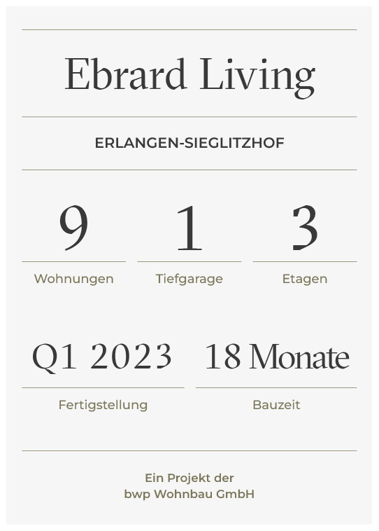 In begehrter Lage in Erlangen Sieglitzhof direkt an der Ebrardstraße ist die exklusive Wohnanlage „Ebrard living“ entstanden. Mit lediglich neun Einheiten überzeugt das Objekt durch viel Komfort, zurückhaltend moderne Architektur, viel Grün und eine ausgezeichnete Energiebilanz.